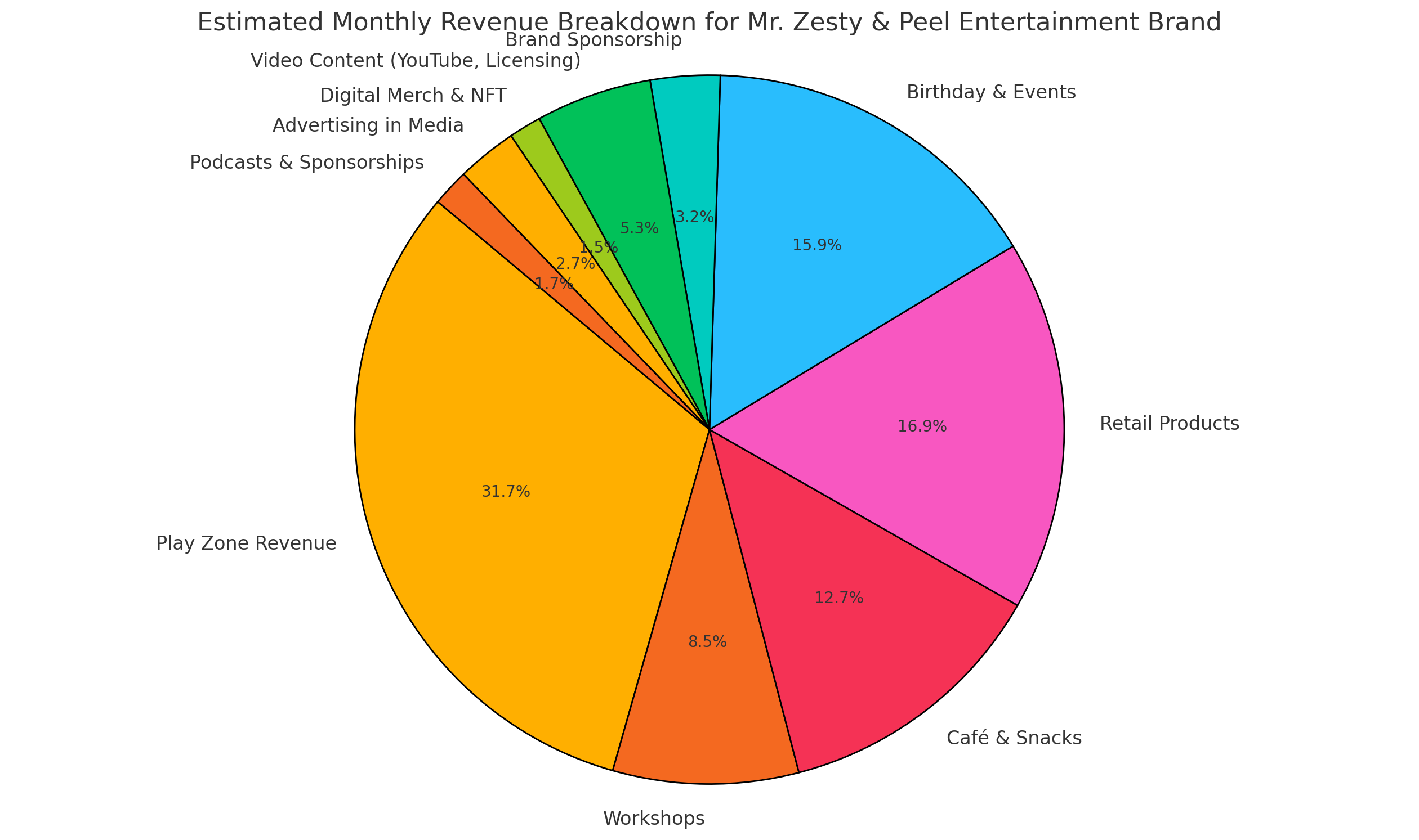 This chart illustrates the diverse income streams of the Mr. Zesty & Peel brand, combining physical experiences (play zone, workshops, café) with digital content (animations, podcasts, and branded media).